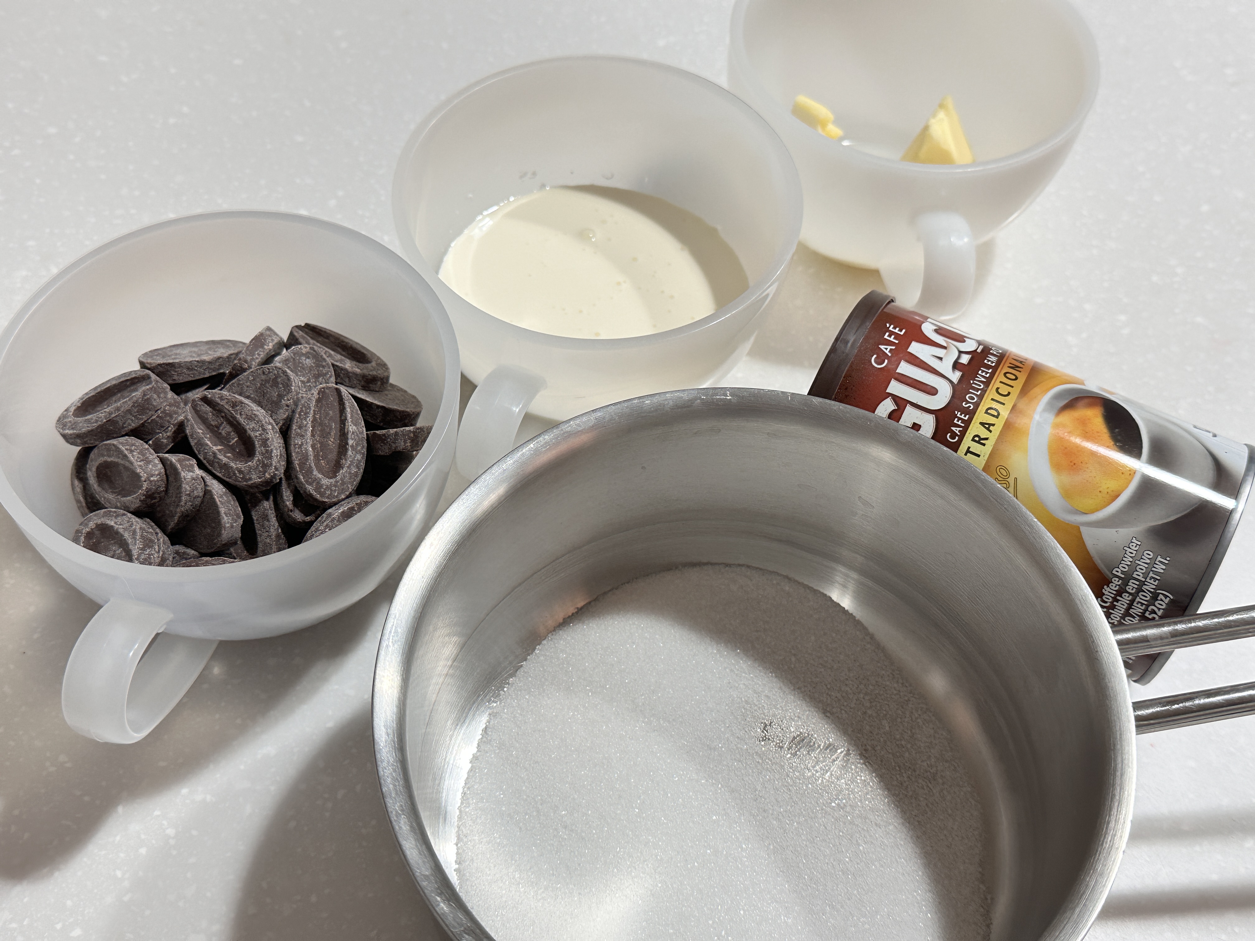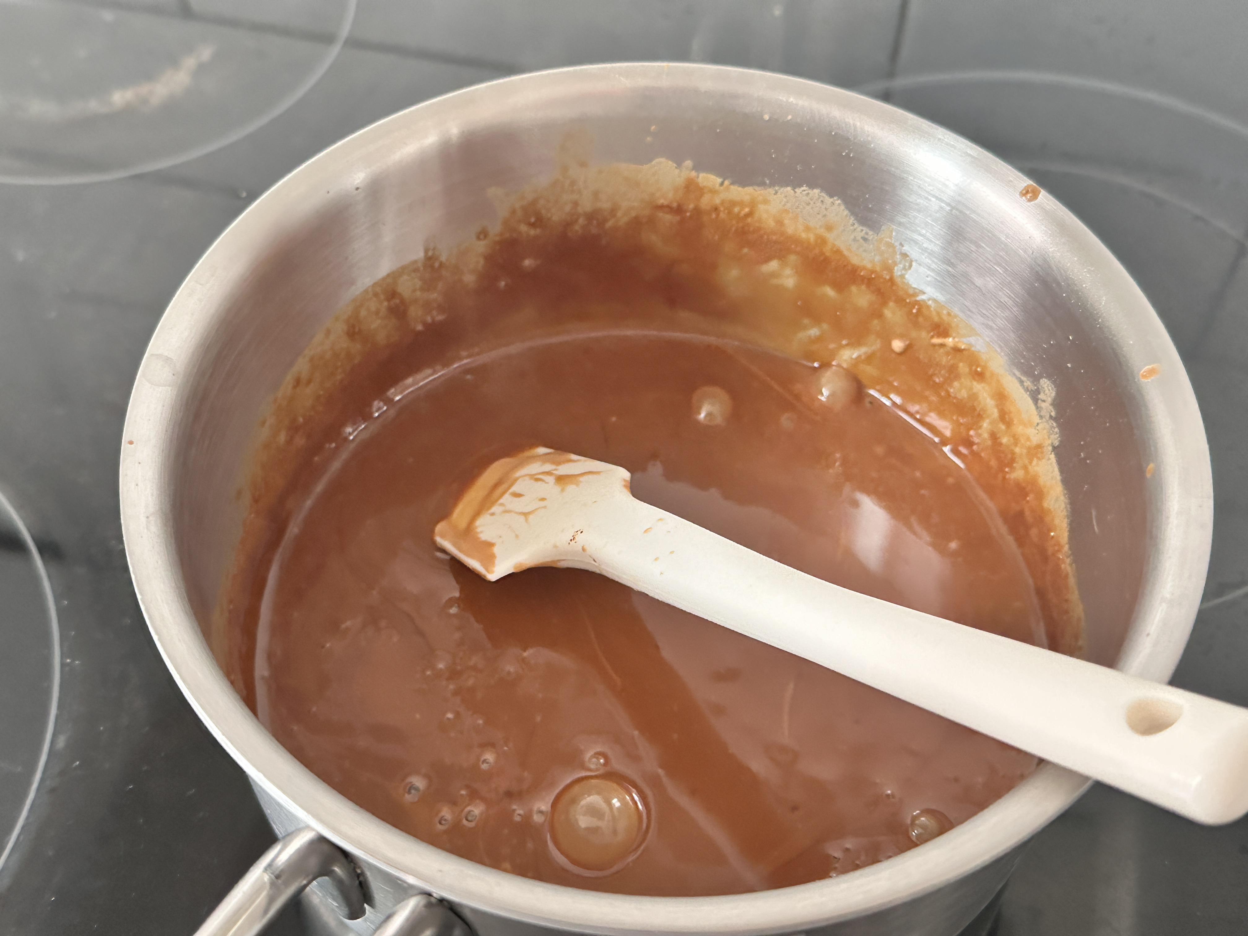 4. 다진 초콜릿과 버터에 카라멜을 부어 잘 녹여주세요.