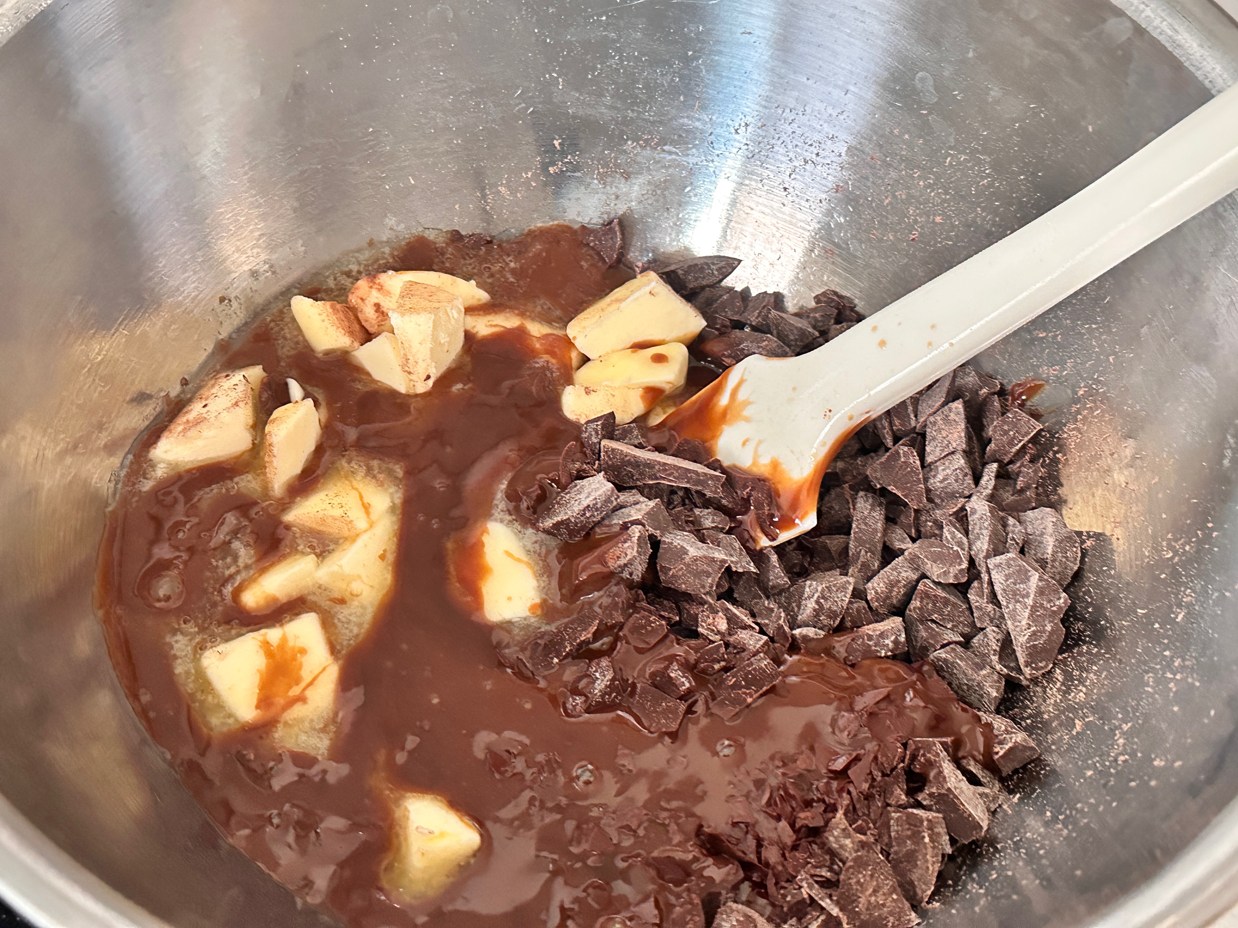 다진 초콜릿과 버터가 담긴 용기에 카라멜을 부어 녹여주세요. 카라멜 온도가 이미 많이 떨어져서 카라멜의 온도만으로 초콜릿과 버터를 녹이긴 힘듭니다. 중탕으로 나머지 초콜릿과 버터를 깨끗하게 녹여주세요. 덩어리가 남아있지 않도록 말이예요.
