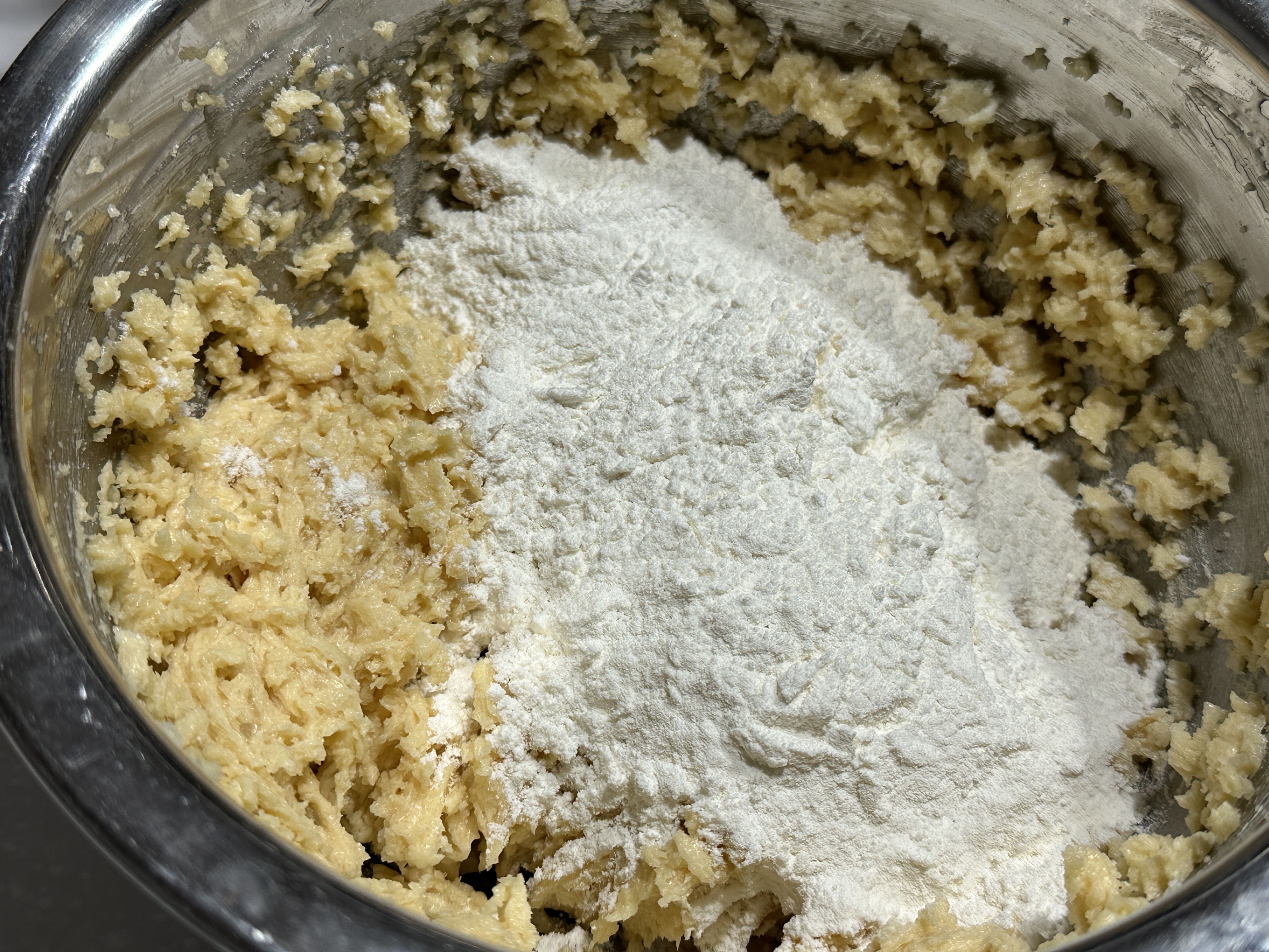 마지막으로 채친 중력분 + 소금을 넣어 핸드믹서로 섞어주세요. 중력분이 사용되는 이유는 박력분 보다 글루텐 형성이 잘 되기 때문이랍니다. 박력분으로 하게 된다면 쫀득한 식감보단 보슬보슬 부서지는 식감이 될 수 있어요. 그렇다고 강력분을 사용하면 너무 질겅거리는 식감이 된답니다.