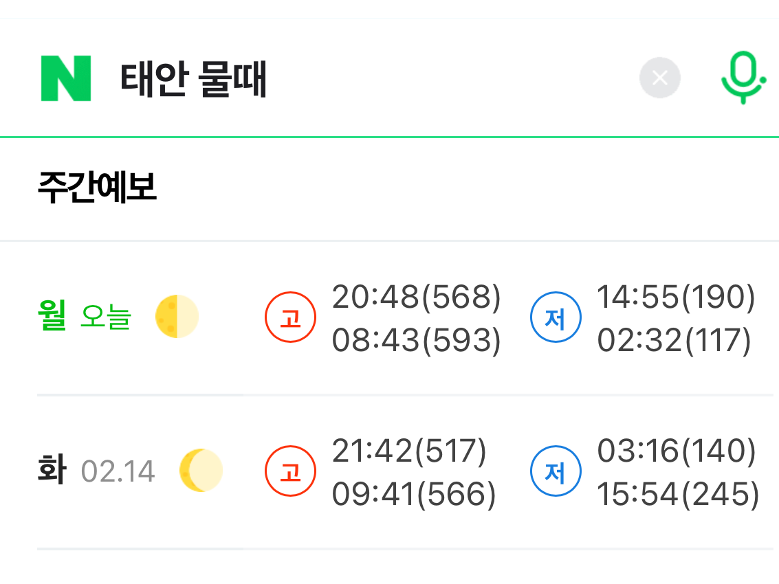 모바일 네이버에서 "태안 물때"로 검색하시면 표가 나옵니다. PC로 보는 것보다 간편하게 나오니 모바일로 검색해서 보시길 바랍니다.