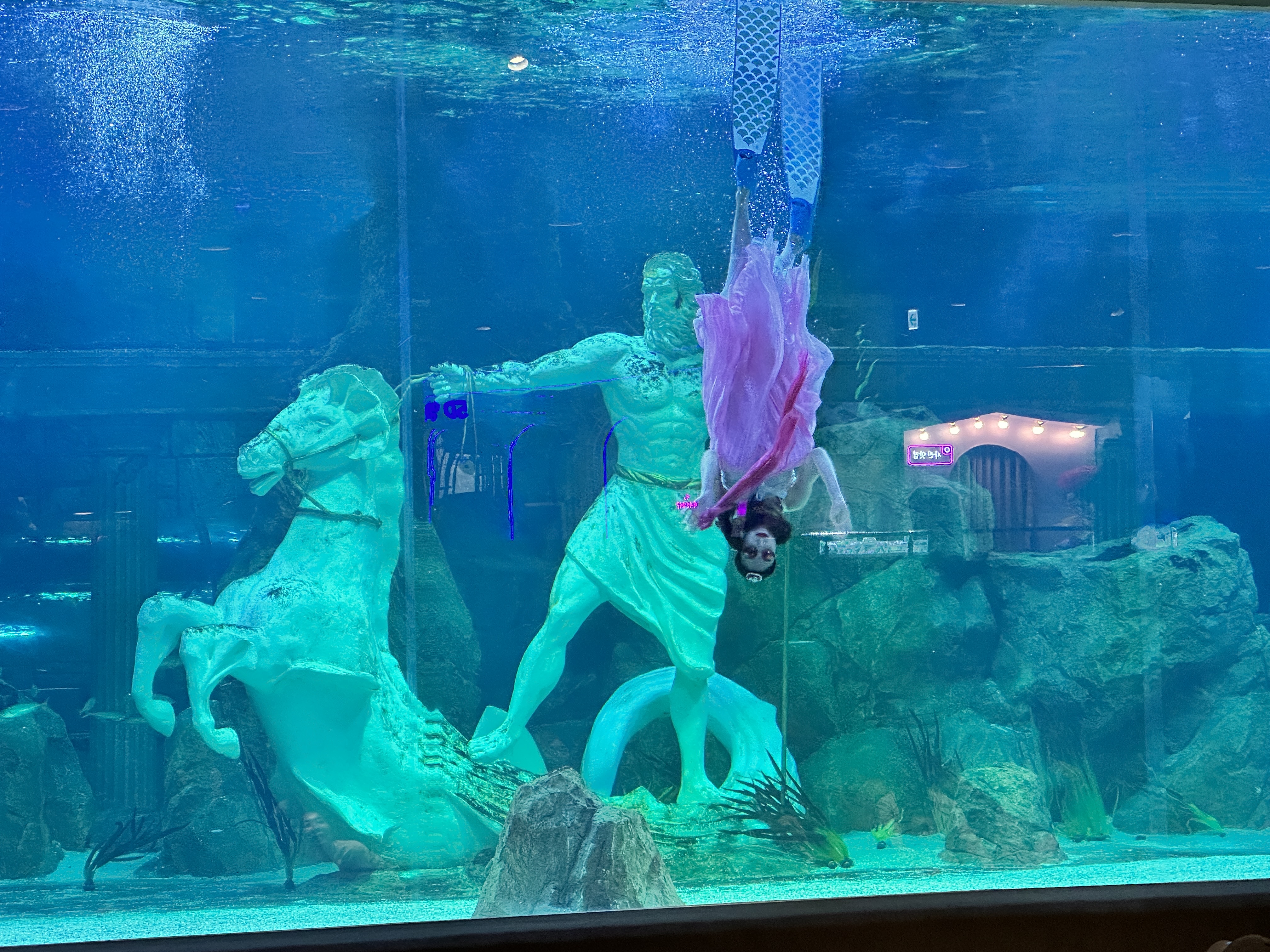 12시 즈음, 피딩 쇼는 꼭 즐기시는 게 좋아요. 가오리들에게 밥을 넣어주는 스쿠버 다이버 분과 물고기들의 캐미가 아주 좋습니다. 마술 쇼는 매 시간 5분마다 시작하는데 마술쇼도 굉장히 재밌어요. 메인 수조에서 공연이 이루어지는데 아이들에게 인기 만점이랍니다. 수중 발레 또한 아이들과 어른들의 마음을 사로잡는 매우 재밌는 공연이었어요.