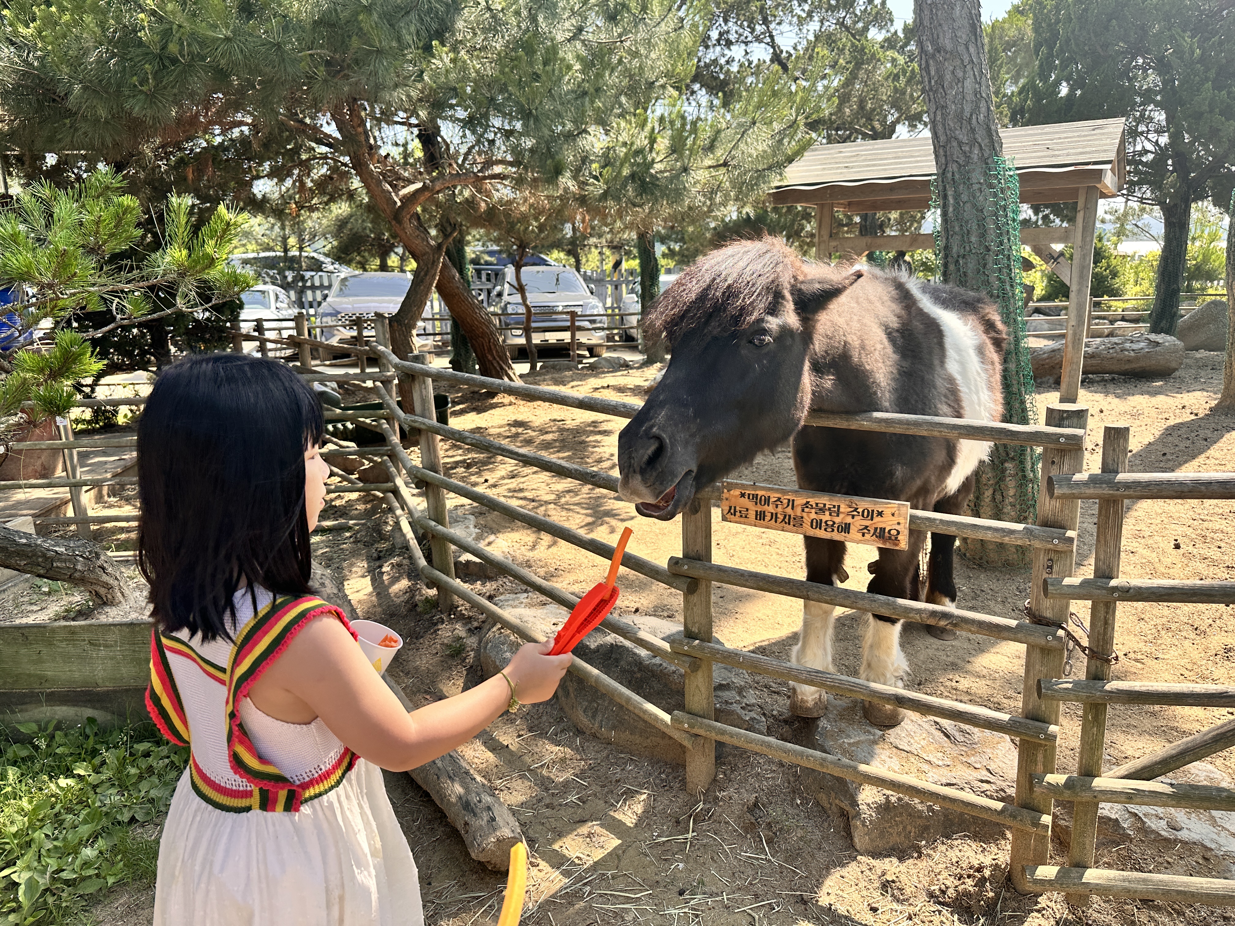 말, 양, 염소, 사슴 등의 친구들은 먹이를 먹을 때 저돌적으로 달겨들어서 어린친구들은 무서울 수 있습니다. 같이 동행했던 3~4세 친구들은 양을 보자마자 와앙! 울어버리더라구요. 양들이 눈을 희번뜩 뜨면서 다가오니 어른들도 절로 움찔하게 됩니다. 먹이주는 곳 앞에서 집게를 이용해 안전하게 먹이를 주도록 합시다. 어린 친구들은 부모님의 케어가 필요해요!