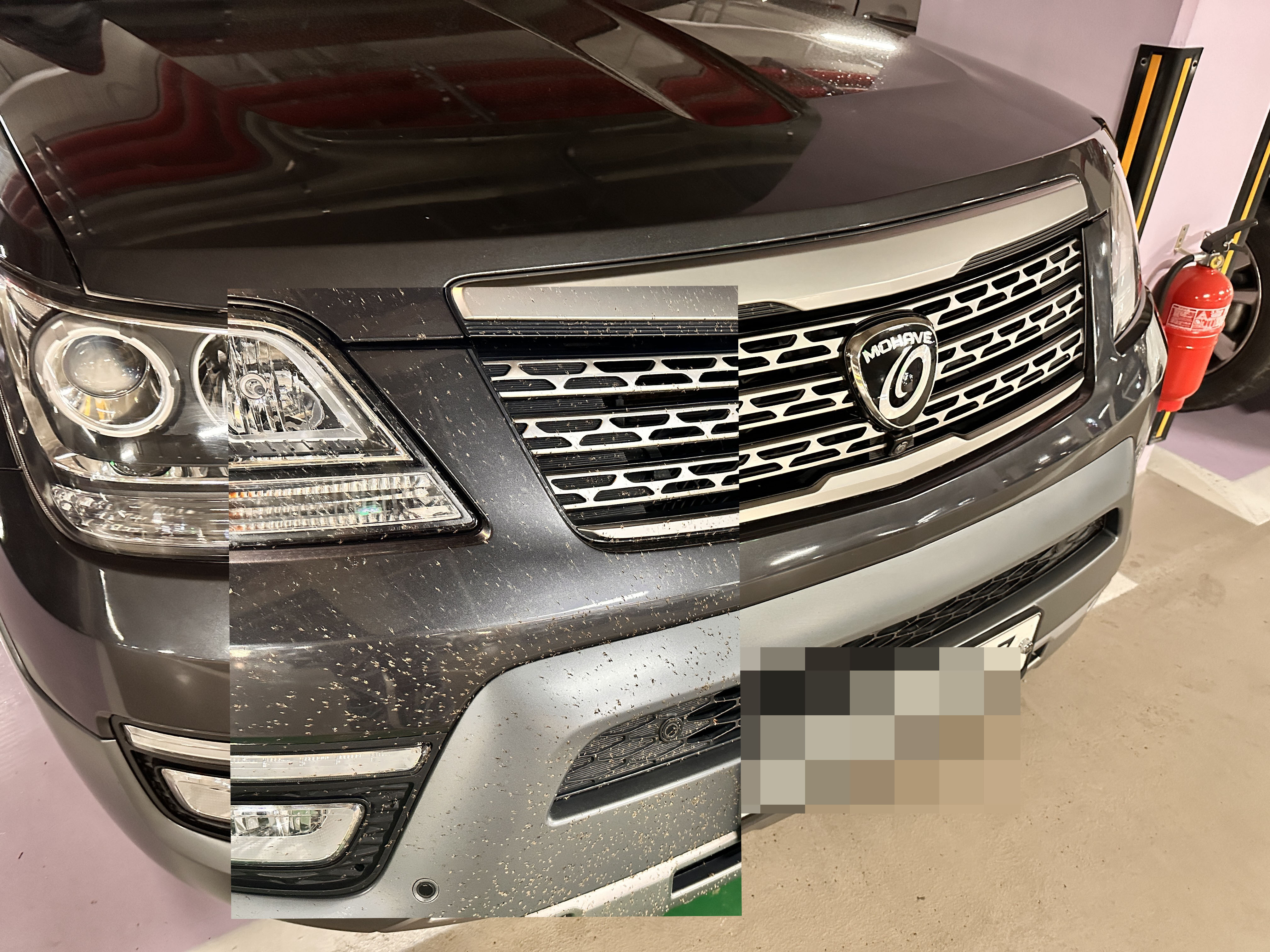 이름 모를 날벌레들로 범벅이 되었습니다. 자동차 전면 카메라에도 붙어서 자동차 주차 표시되는 화면에 커다란 얼룩이 보여서 얼마나 놀랬는지. 자동차 엠블럼에는 커다란 벌레 한마리가 딱! 참 난감합니다.