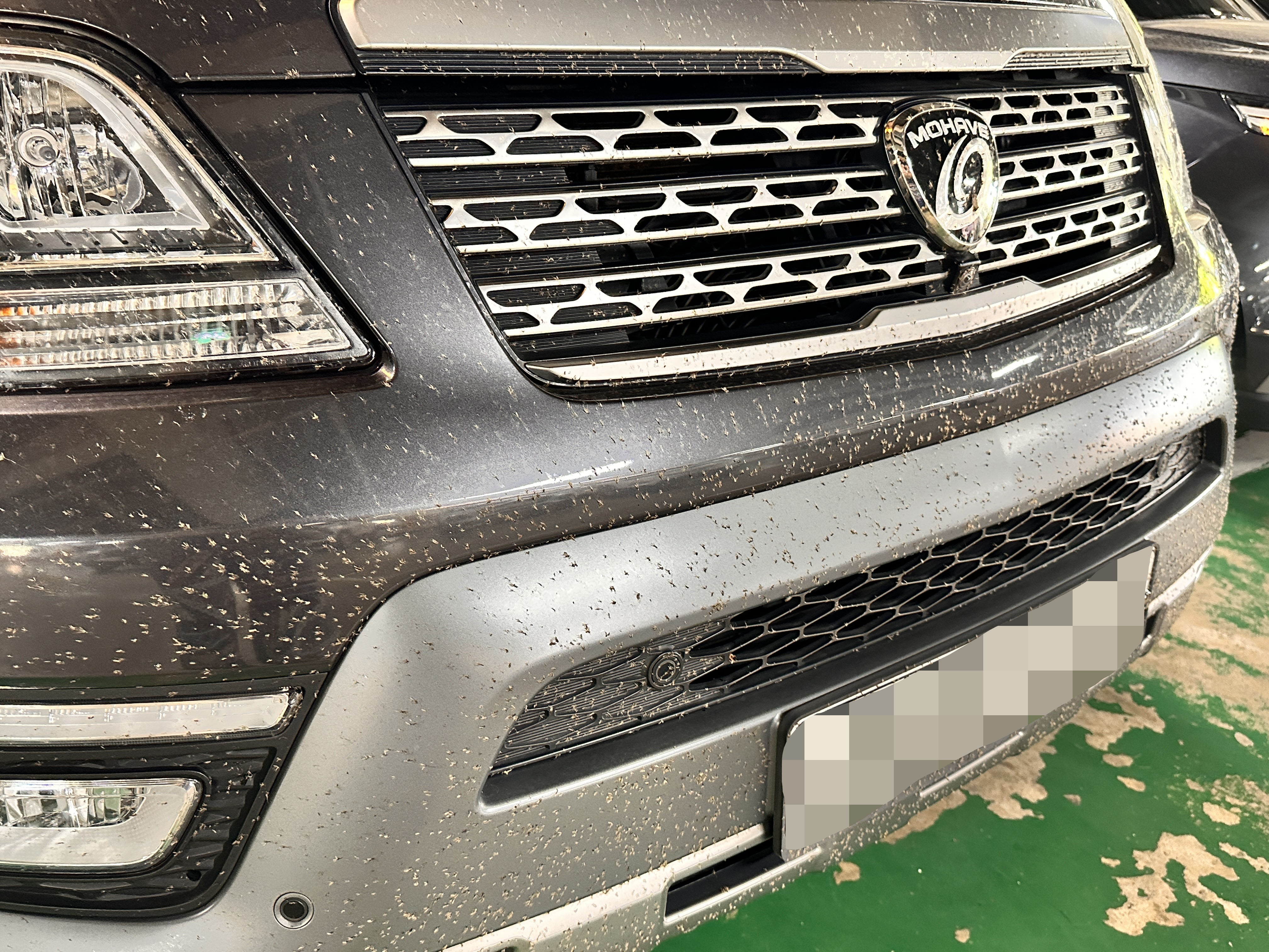 참담한 모습입니다. 날벌레들의 모습이 그대로 박제되듯 붙어있습니다. 실제로 운행할 때 창문과 앞 범퍼에 틱틱 하는 소리가 들려서 운전하는데 집중이 안되더라구요. 이래서 여름 야간운전은 기피하고 싶습니다.