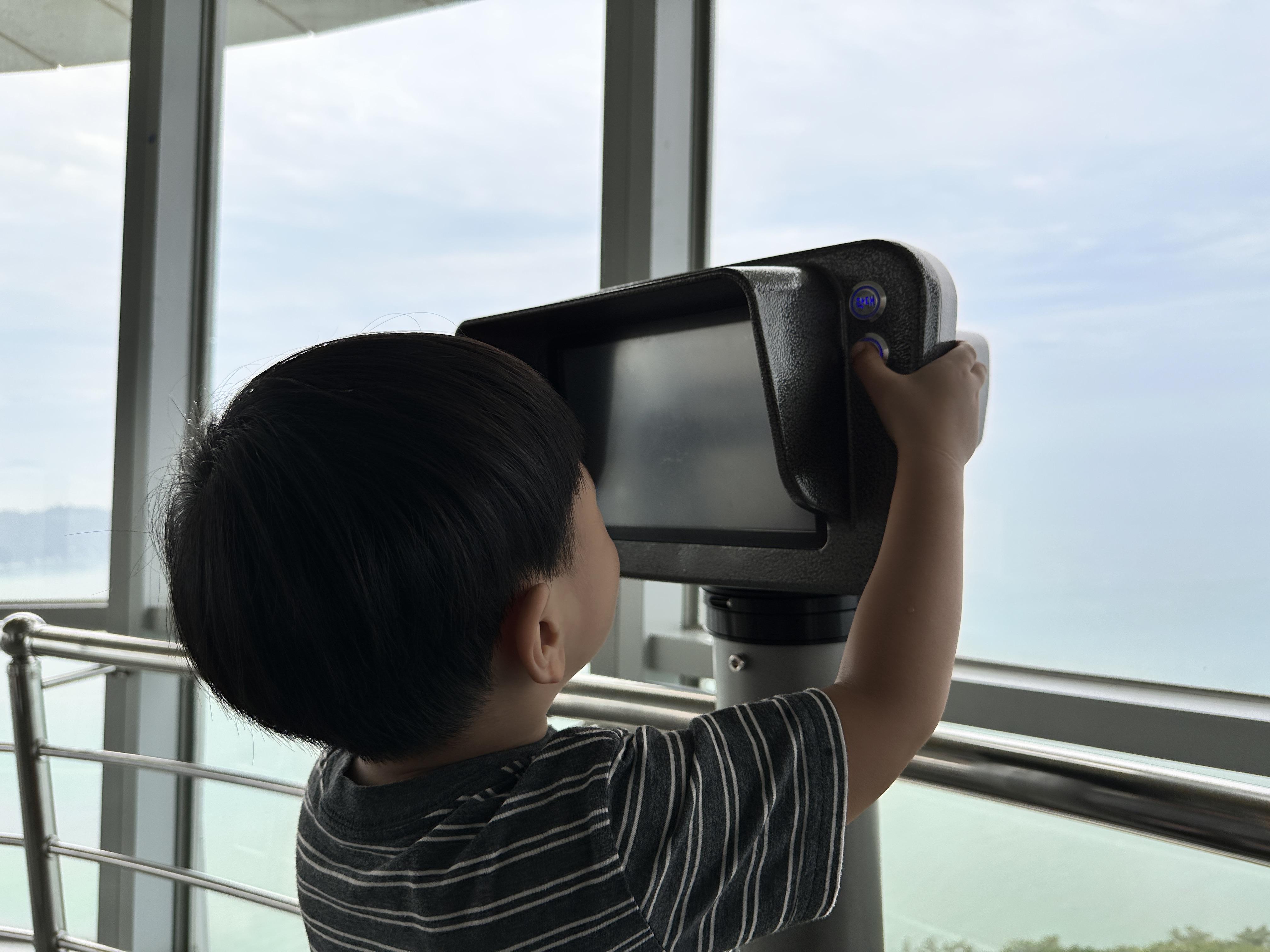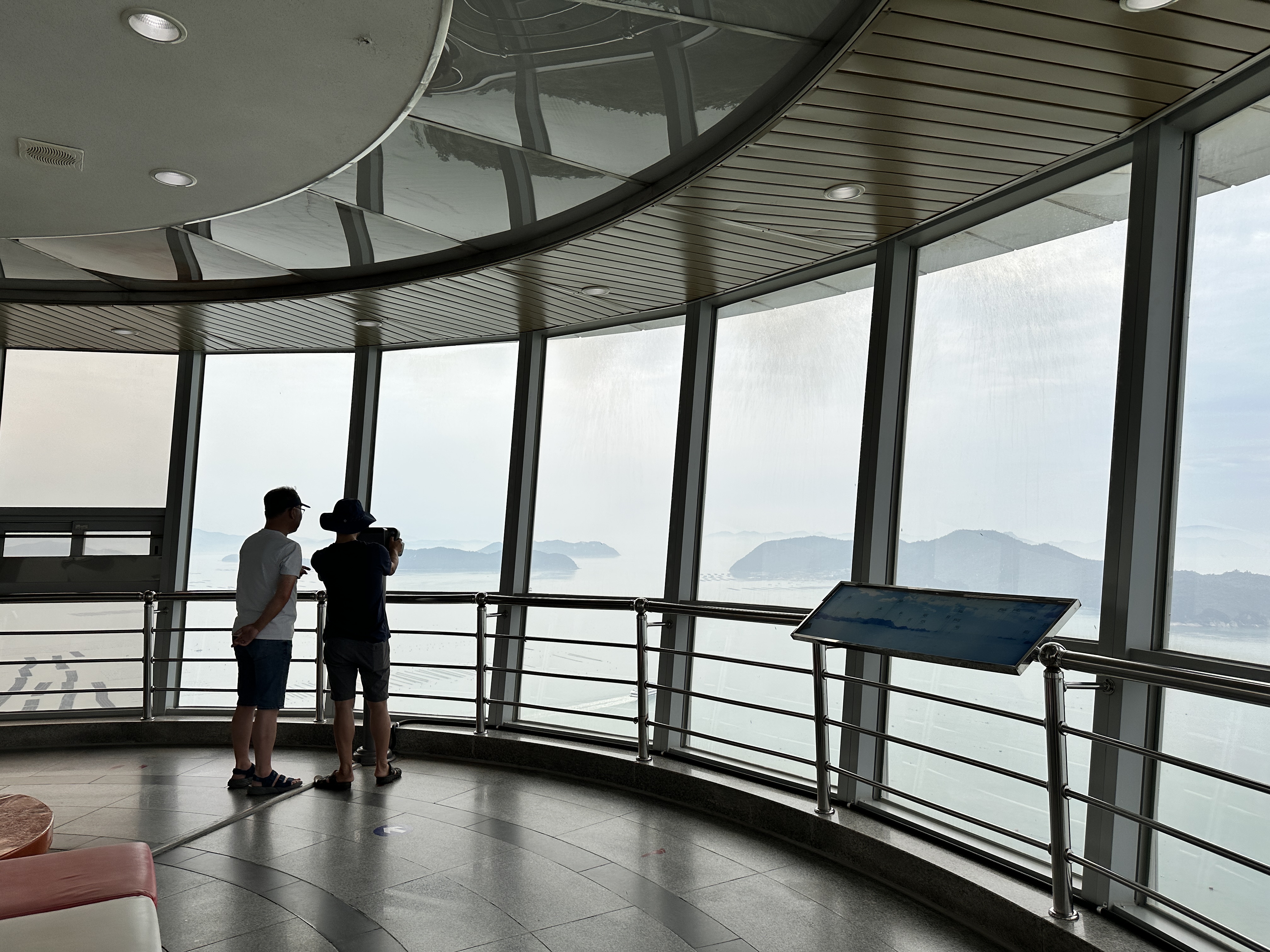 이 날 날씨가 좋지 않아서 해무 때문에 뭐가 보이질 않더라고요. 날만 좋으면 남해에 있는 모든 섬들을 볼 수 있데요. 섬 이름이 창문에 붙어있어요. 아이들과 함께 찾아보는 것도 좋을 것 같아요.
