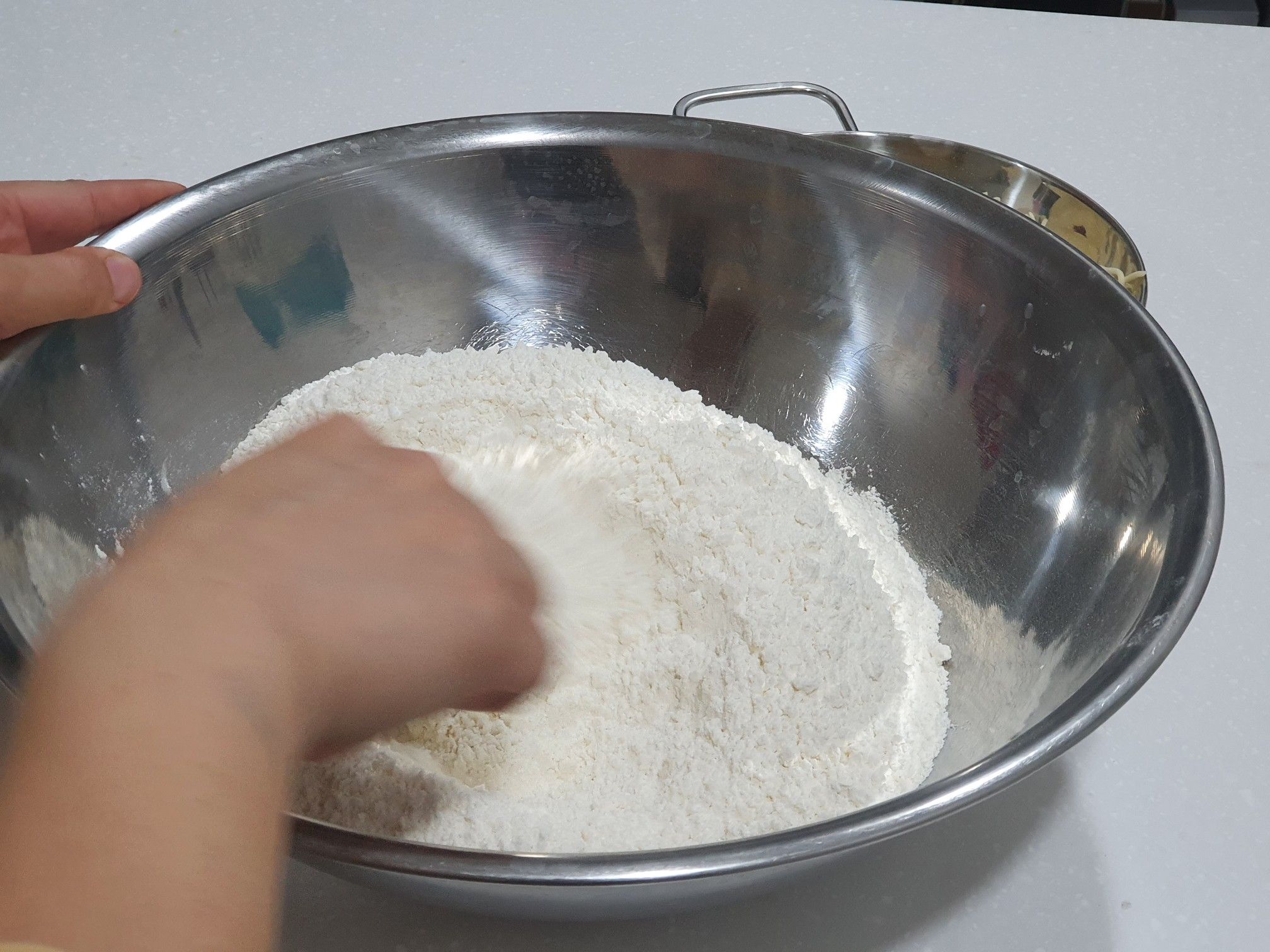 먼저 밀가루와 베이킹파우더, 소금을 잘 섞어줍니다.